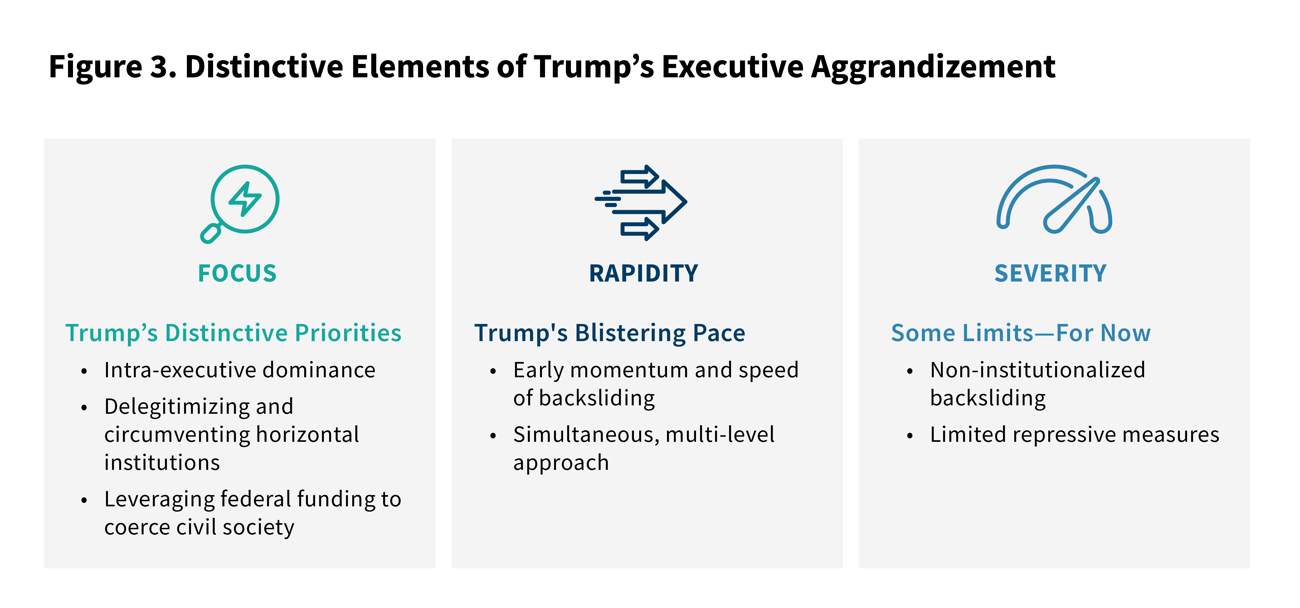 2. Rapidity: The administration has carried out its political program with striking speed. Compared to other backsliding cases, it has sought to centralize power with greater momentum and rapidity. And while other leaders often eroded democratic checks piece by piece, Trump’s team is working to weaken such checks across multiple levels all at once.