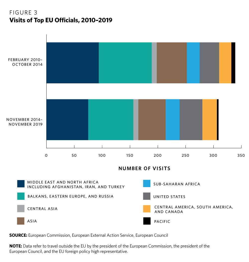 In terms of regional distribution, travel to countries in the EU’s neighborhood accounted for 44 percent of total travel—a reduction from over half in 2010–2014. Asia was the second most popular destination region, representing almost 20 percent of total visits, but with fewer trips than in the previous period. By contrast, EU officials traveled more often to sub-Saharan Africa (twenty-five visits) and to Canada (eight).