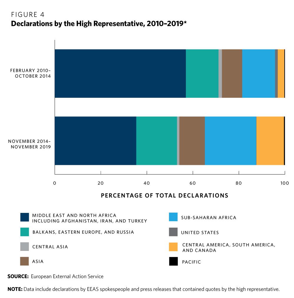 Altogether, references to events in the EU’s neighboring regions amounted to only 40 percent of all high representative declarations in 2014–2019, against more than 55 percent in 2010–2014.