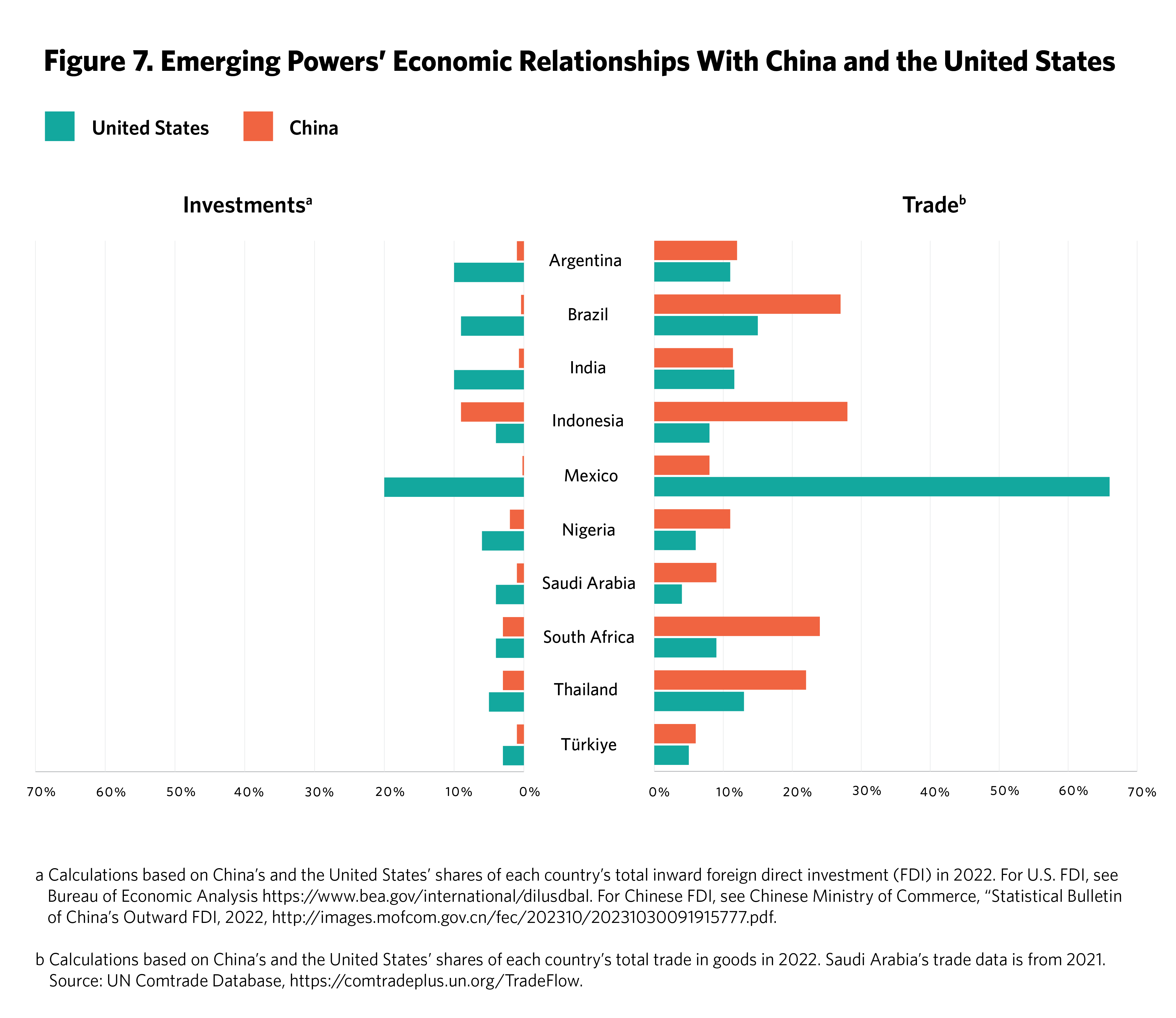All the emerging powers have strong economic ties with China. Figure 7 illustrates their economic relationships with it and the United States. China makes up a larger share of their total trade in goods, except for India and Mexico. The United States, however, has a much larger share of total inward foreign direct investment (FDI) stocks for nine of them, reflecting the fact that it has been investing overseas and accumulating FDI stock for much longer than China.3