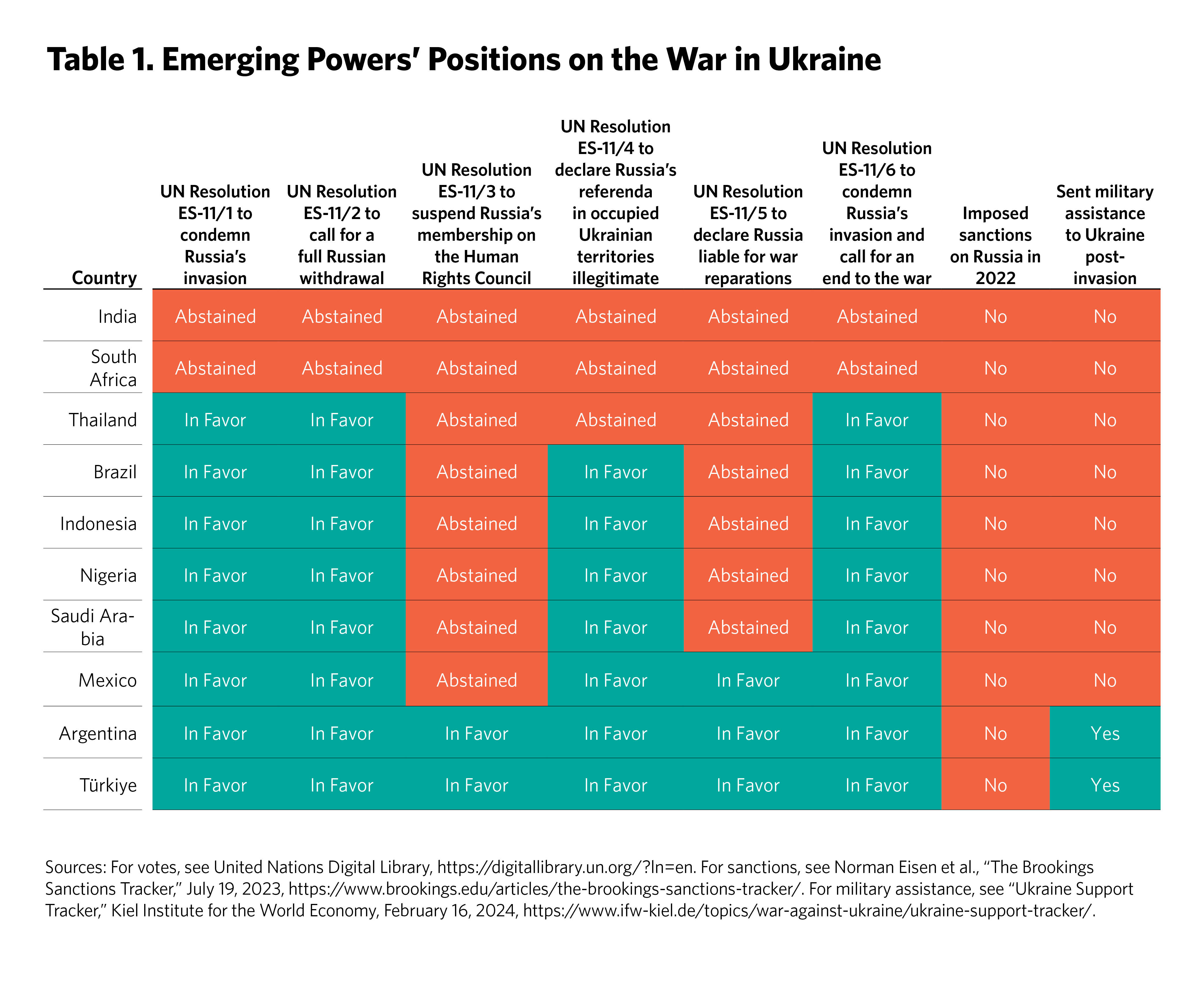 To assess the positions of these ten emerging powers on the war in Ukraine and on U.S.-China competition, we analyzed how they voted on several UN General Assembly resolutions, as well as their trade and investment patterns with China, Russia, and the United States. We also examined public statements by their leaders, the nature of their defense relationships, and their diplomatic behavior over time. In addition, we conducted off-the-record interviews with high-level diplomats from these countries about their positions on the war in Ukraine, China, and the international order. We sought to ascertain the extent to which these positions were shaped by their economic interests, domestic politics, geographies, visions of the international order, Chinese or Russian propaganda, and concerns for democracy and human rights abroad. We also held off-the-record roundtables with key senior officials from the White House, in an effort to understand their thinking and perspectives on the policy challenges for the United States. In the process, we published individual case studies for each country.7