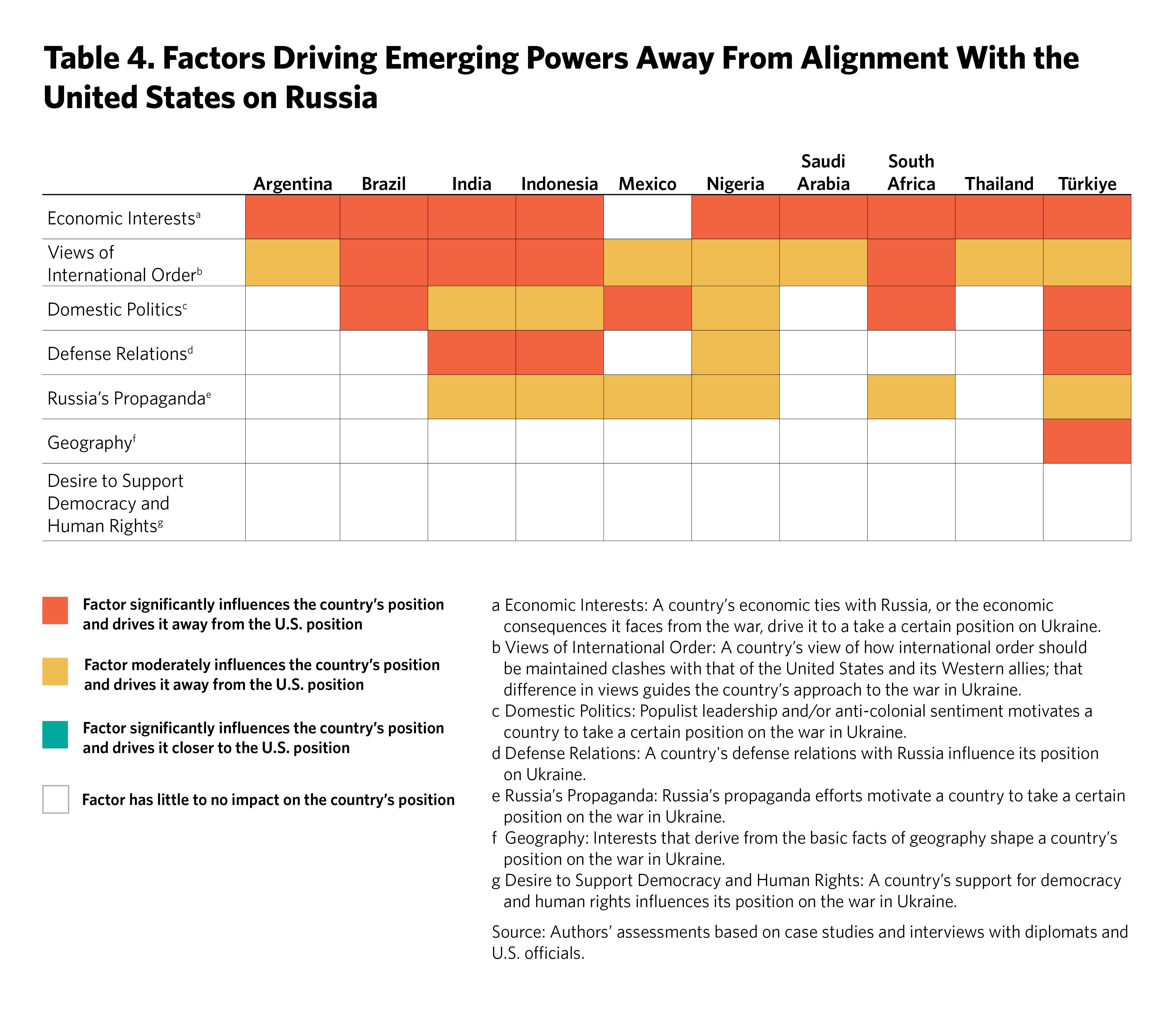 The next two chapters of this report outline the positions these ten emerging powers have taken on the war in Ukraine and on U.S.-China competition and evaluate the degree of their alignment with the United States. Overall, the emerging powers are loath to pick a side in strategic competition between great powers. Their approaches to the war in Ukraine and U.S.-China competition have, for the most part, involved striking a middle ground. Some have pursued courses of action that run counter to the strategic objectives of the United States; others have acted in closer alignment with it.